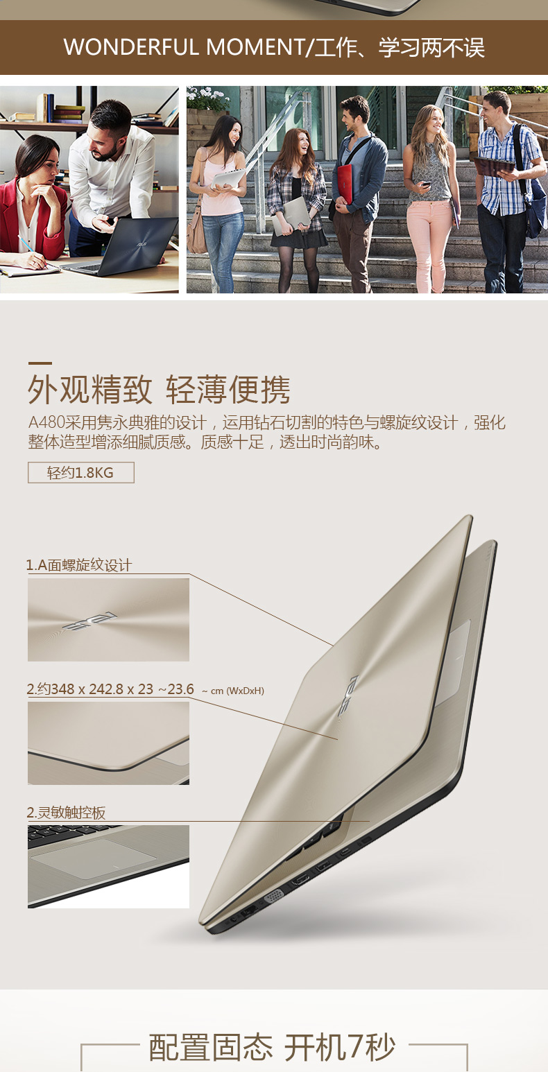 华硕(ASUS)笔记本电脑K456/A480U14英寸7代I3商务轻薄学生上网